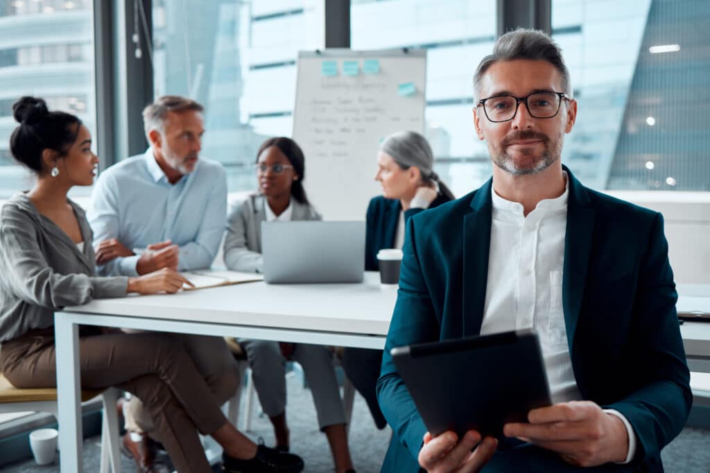 Ceo, businessman and smile portrait with tablet for meeting success, teamwork collaboration and discussion in office. Senior man, employee positive mindset energy or entrepreneur tech motivation.