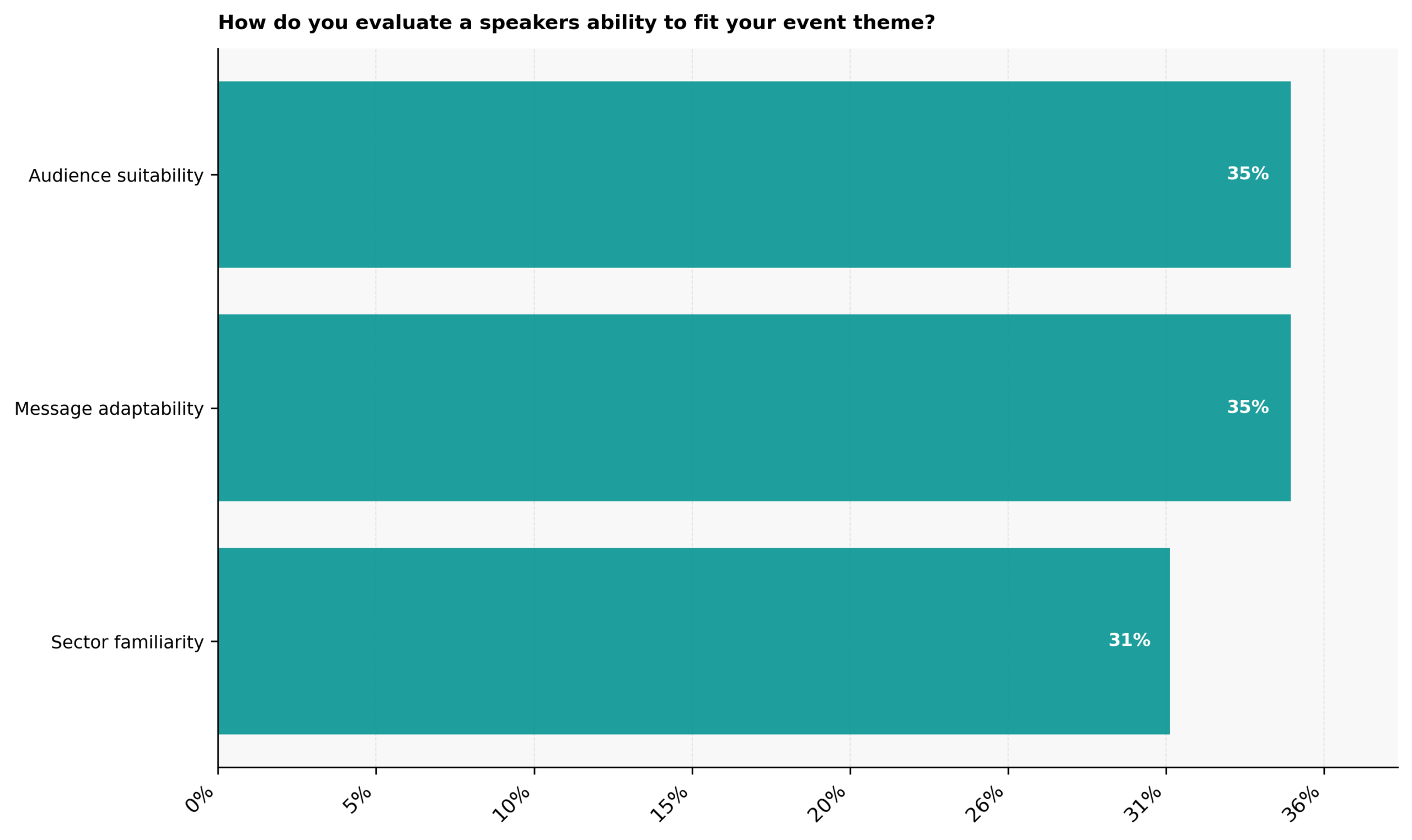 Audience suitability and message adaptability are equally weighted at 35% each, showing that fit is judged by whether ideas resonate and can be shaped to match the tone and goals of the event. Sector familiarity follows closely at 31%, pointing to the value of contextual understanding without requiring deep specialization.