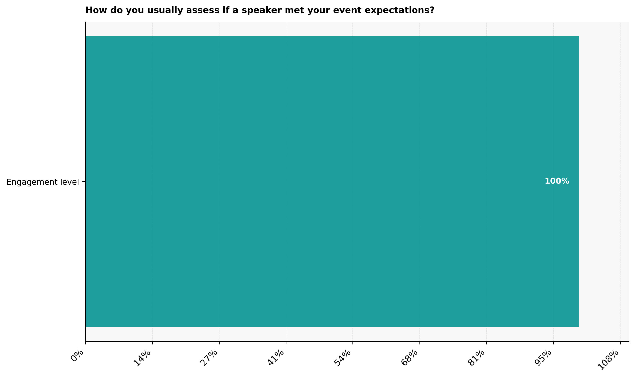 Assessment on whether a futurist speaker met event expectations is unanimous. Engagement level is used by 100% of business leaders who have booked futurist speakers for their events as the measure, showing clear agreement on what success looks like.