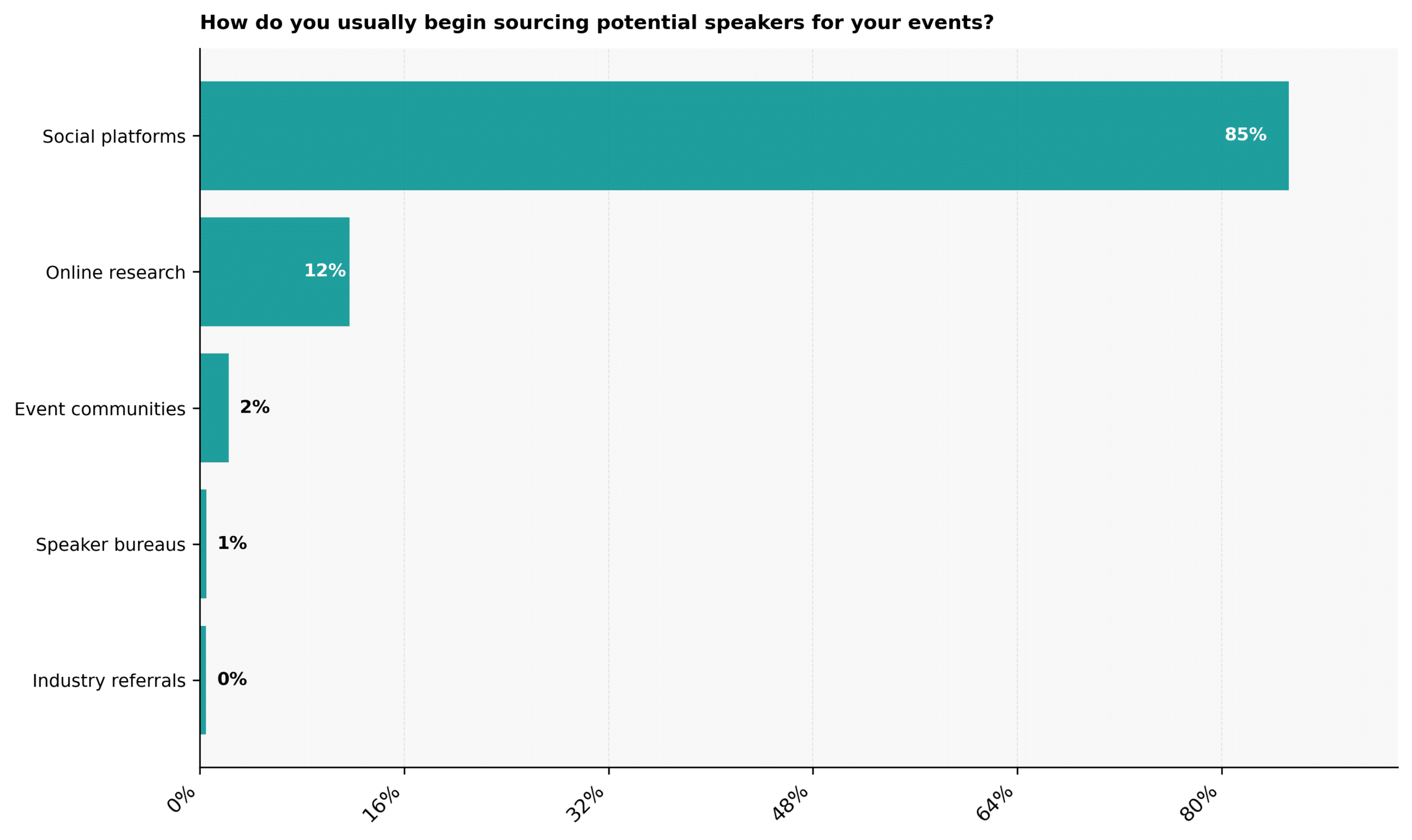 Online research follows at 12%, suggesting a secondary step once initial options surface. Event communities account for 2%, while speaker bureaus sit at 1%, indicating more limited use for early discovery. Industry referrals register at 0%, showing that sourcing now starts publicly rather than through private networks.
