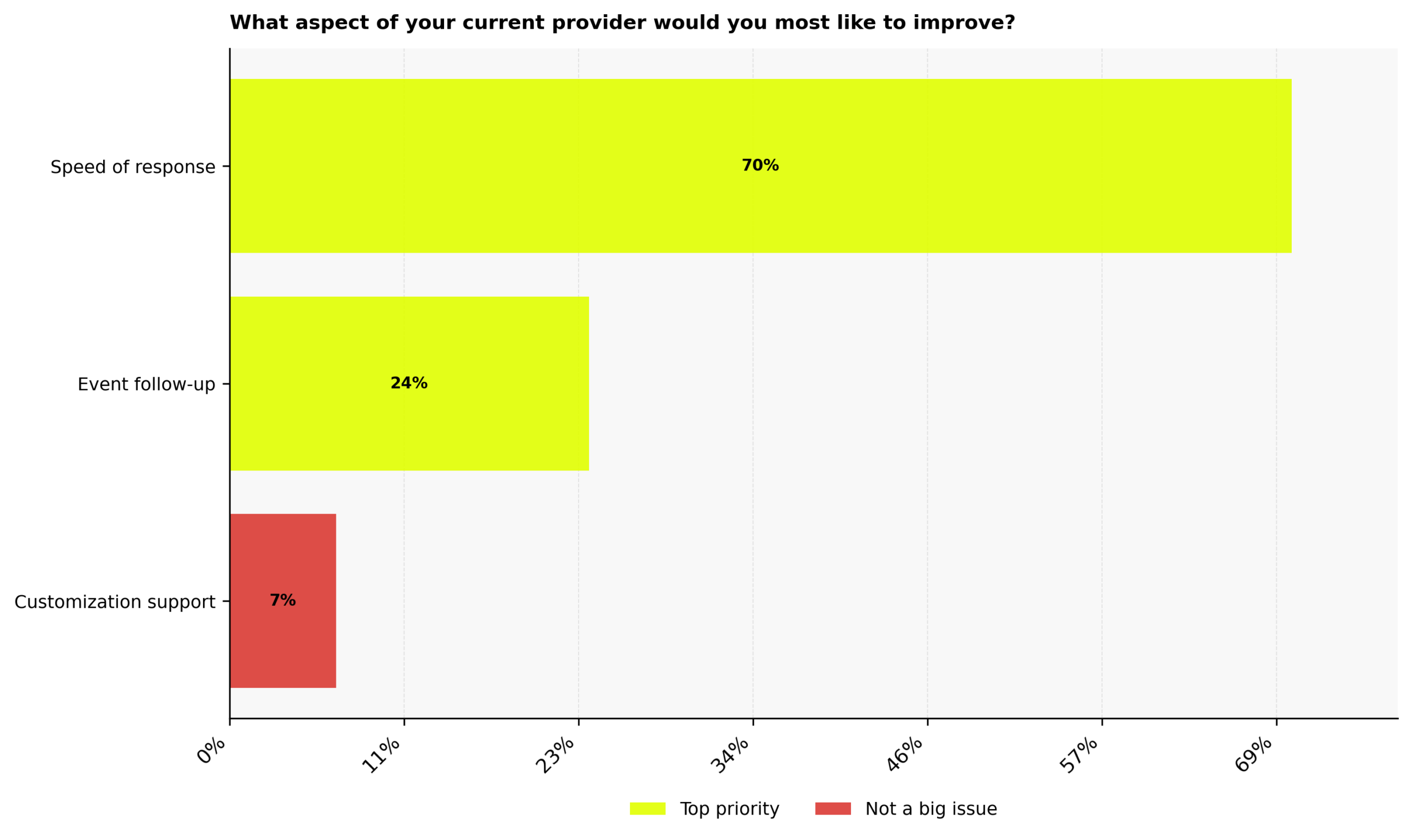 Given that 46% of customers expect companies to respond in less than four hours, it’s not surprising that the aspect business leaders who have booked futurist speakers for their events in our audience would most like to improve in their service provider is speed of response, with 70% naming this as their top priority. When timelines are tight and decisions need to move quickly, slow communication becomes an immediate friction point.