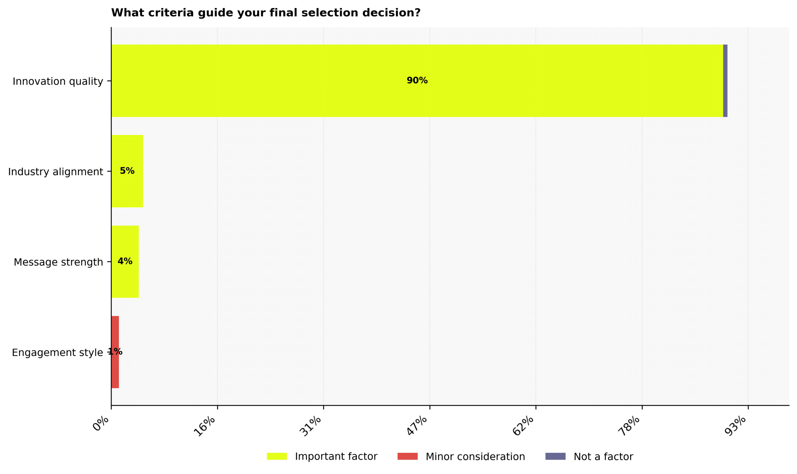 Industry alignment, cited as important by 5%, plays a narrower role, helping confirm relevance rather than driving the choice. Message strength follows at 4%, suggesting clarity supports confidence but rarely overrides substance. Engagement style appears only as a minor consideration for 1%, indicating that delivery influences earlier stages, while innovation ultimately determines the final call.