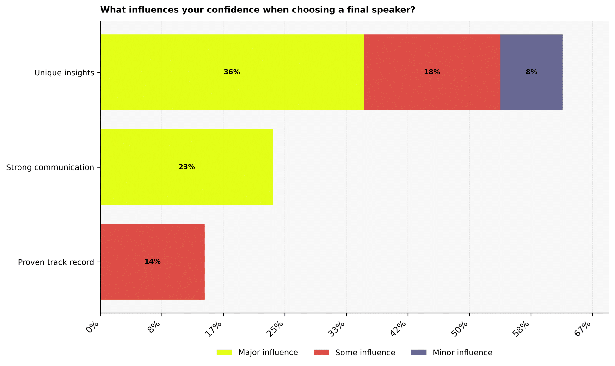 Confidence in a final futurist speaker is shaped first by the strength of their thinking. Unique insights are a major influence for 36% of business leaders who have booked futurist speakers for their events, with 18% seeing them as having some influence and 8% as a minor one, suggesting decision-makers look for perspectives that challenge familiar narratives rather than repeat well-worn trends.