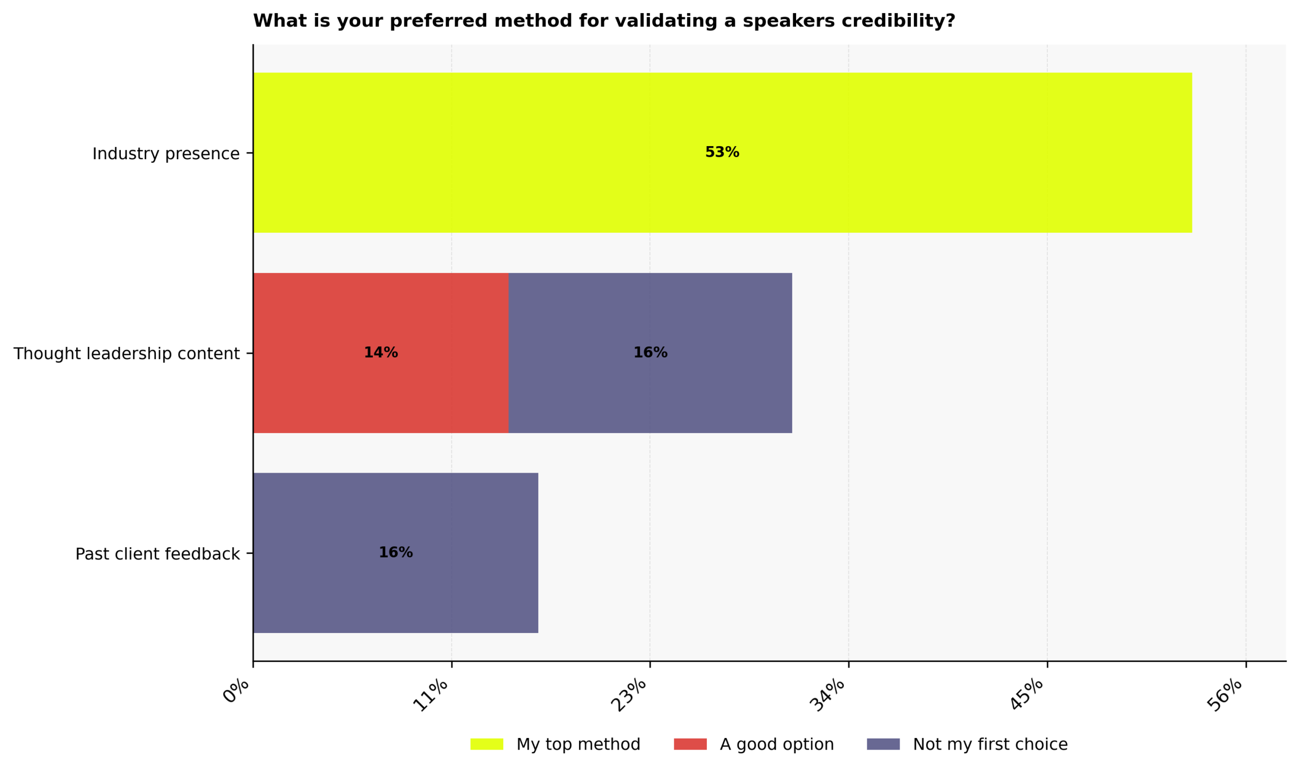 - 53% of business leaders who have booked futurist speakers for their events say that industry presence is their top method for validating a speaker’s credibility