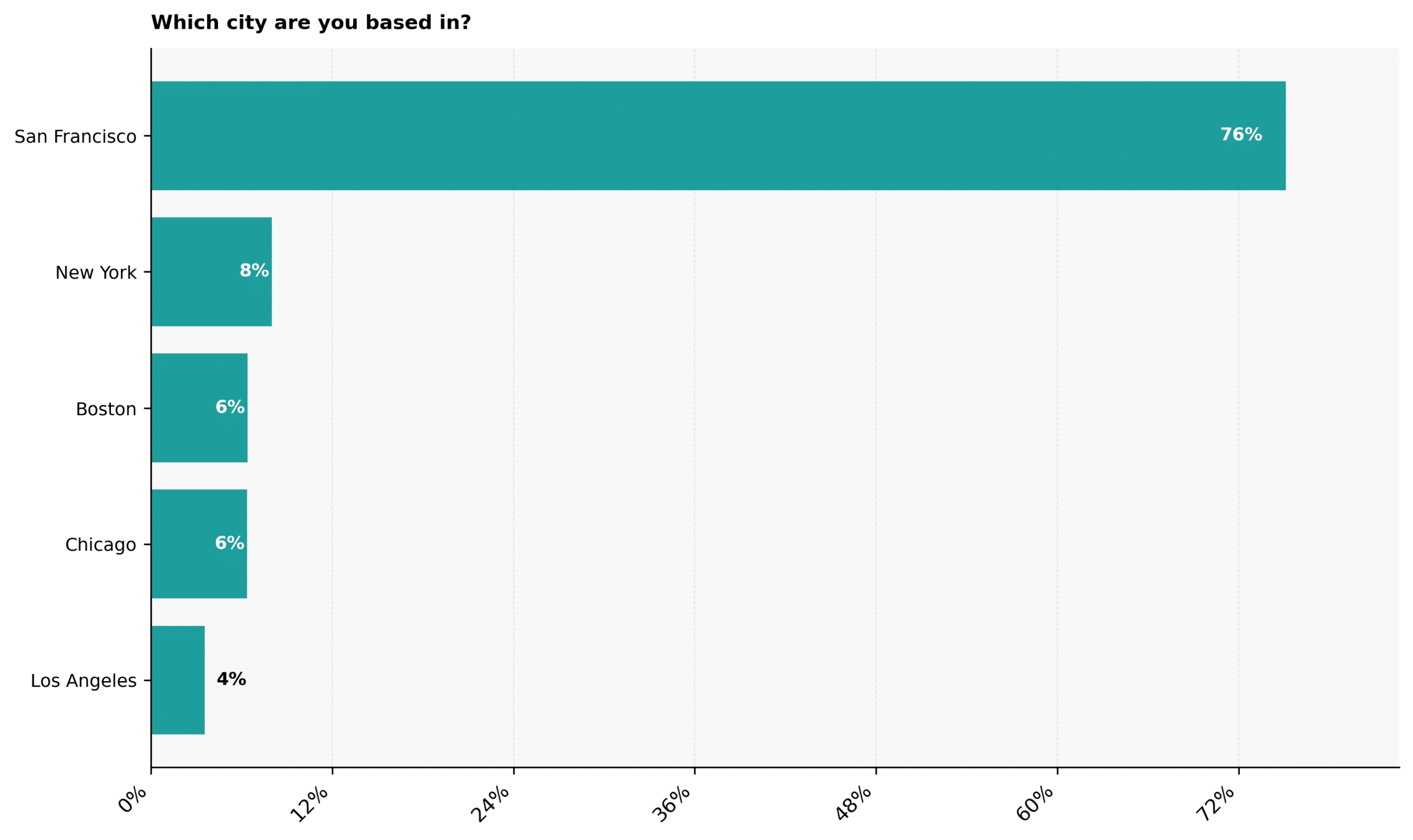 Boston and Chicago each account for 6%, suggesting steady representation from cities with strong academic and commercial foundations. Los Angeles rounds out the list at 4%, indicating a smaller but notable presence tied to creative and innovation-led industries.